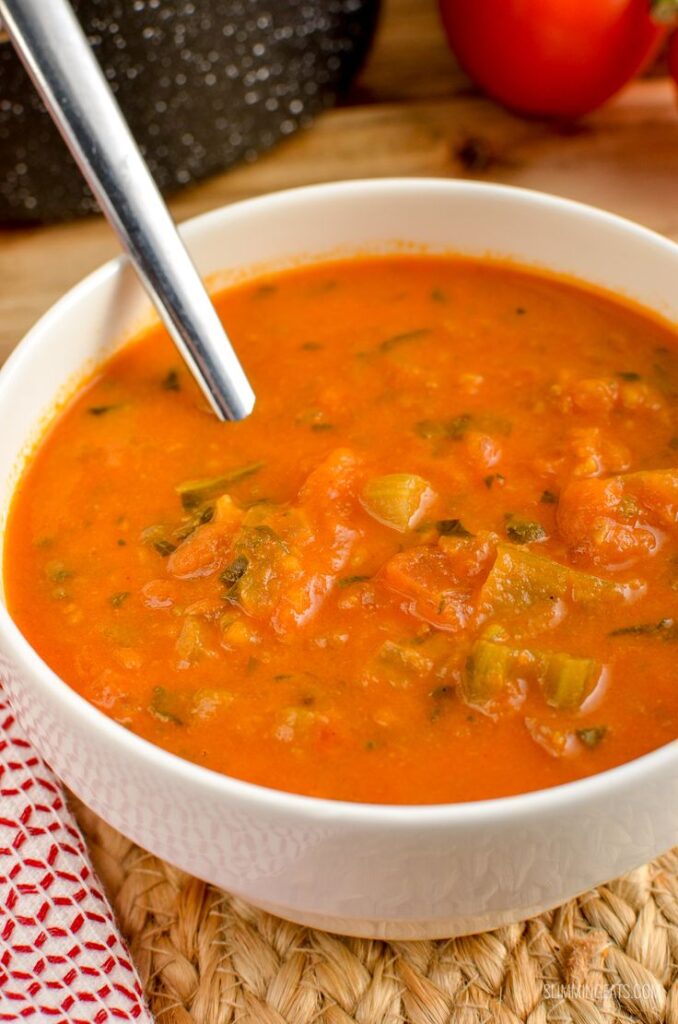 This isn’t your regular tomato soup. Infused with Indian masalas and fresh basil, it’s tangy, lightly spiced, and under 100 calories per serving!